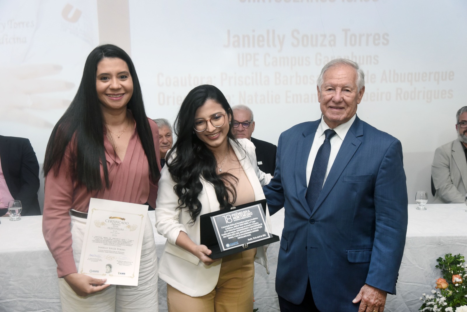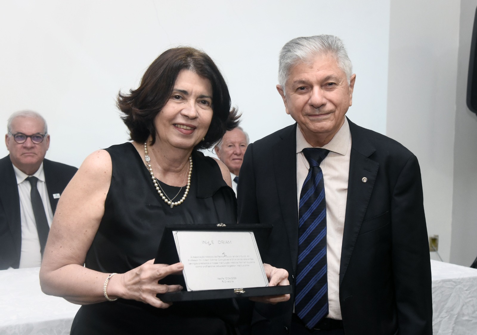 No momento, em homenagem in memoriam ao dr. Gilson Edmar, vice-presidente da AMPE, foi entregue uma placa à sua esposa, Vitória Menezes, em homenagem pela trajetória na instituição.